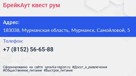 БрейкАут, квест-рум по адресу 183038, Мурманская область, Мурманск, Самойловой, 5 в дальнейшем Организация, размещена в следующих категориях: