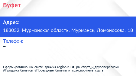 Буфет по адресу 183032, Мурманская область, Мурманск, Ломоносова, 18 в дальнейшем Организация, размещена в следующих категориях:
