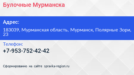 Булочные Мурманска по адресу 183039, Мурманская область, Мурманск, Полярные Зори, 23 в дальнейшем Организация, размещена в следующих категориях: