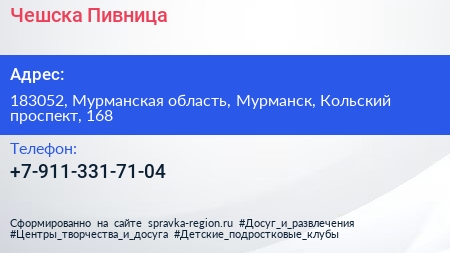 Чешска Пивница по адресу 183052, Мурманская область, Мурманск, Кольский проспект, 168 в дальнейшем Организация, размещена в следующих категориях: