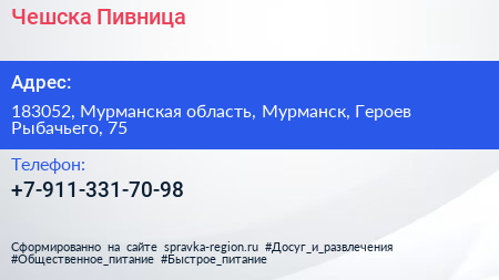 Чешска Пивница по адресу 183052, Мурманская область, Мурманск, Героев Рыбачьего, 75 в дальнейшем Организация, размещена в следующих категориях: