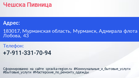 Чешска Пивница по адресу 183017, Мурманская область, Мурманск, Адмирала флота Лобова, 43 в дальнейшем Организация, размещена в следующих категориях: