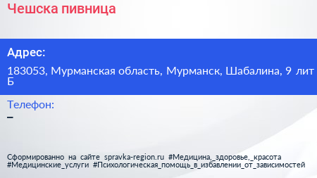Чешска пивница по адресу 183053, Мурманская область, Мурманск, Шабалина, 9 лит Б в дальнейшем Организация, размещена в следующих категориях: