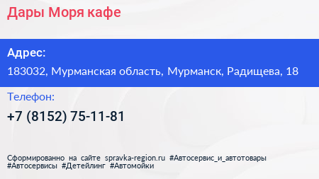 Дары Моря, кафе по адресу 183032, Мурманская область, Мурманск, Радищева, 18 в дальнейшем Организация, размещена в следующих категориях: