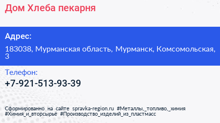 Дом Хлеба, пекарня по адресу 183038, Мурманская область, Мурманск, Комсомольская, 3 в дальнейшем Организация, размещена в следующих категориях: