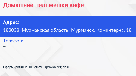 Домашние пельмешки, кафе по адресу 183038, Мурманская область, Мурманск, Коминтерна, 18 в дальнейшем Организация, размещена в следующих категориях: