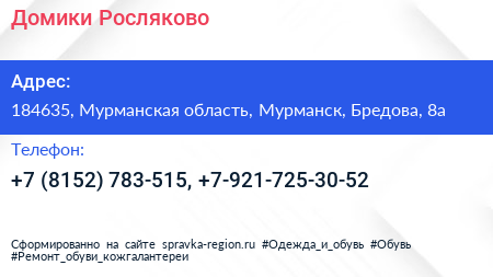 Домики Росляково по адресу 184635, Мурманская область, Мурманск, Бредова, 8а в дальнейшем Организация, размещена в следующих категориях: