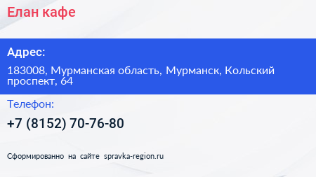 Елан, кафе по адресу 183008, Мурманская область, Мурманск, Кольский проспект, 64 в дальнейшем Организация, размещена в следующих категориях: