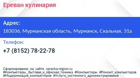 Ереван, кулинария по адресу 183036, Мурманская область, Мурманск, Скальная, 31а в дальнейшем Организация, размещена в следующих категориях: