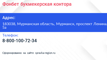 Фонбет, букмекерская контора по адресу 183038, Мурманская область, Мурманск, проспект Ленина, 5а в дальнейшем Организация, размещена в следующих категориях: