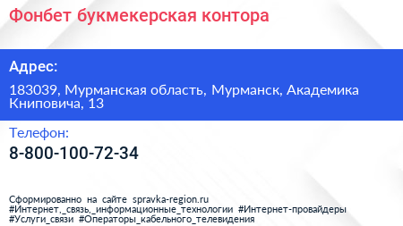 Фонбет, букмекерская контора по адресу 183039, Мурманская область, Мурманск, Академика Книповича, 13 в дальнейшем Организация, размещена в следующих категориях: