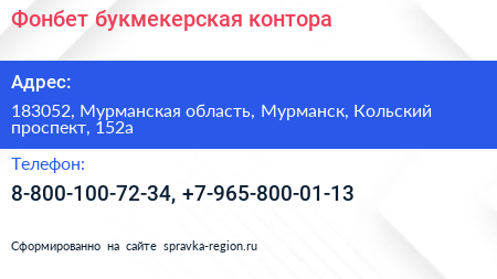 Фонбет, букмекерская контора по адресу 183052, Мурманская область, Мурманск, Кольский проспект, 152а в дальнейшем Организация, размещена в следующих категориях:
