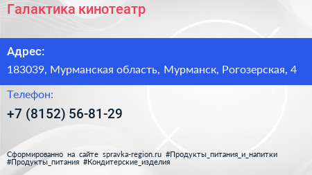 Галактика, кинотеатр по адресу 183039, Мурманская область, Мурманск, Рогозерская, 4 в дальнейшем Организация, размещена в следующих категориях: