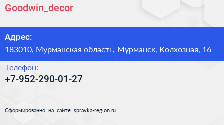 Goodwin_decor по адресу 183010, Мурманская область, Мурманск, Колхозная, 16 в дальнейшем Организация, размещена в следующих категориях: