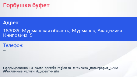 Горбушка, буфет по адресу 183039, Мурманская область, Мурманск, Академика Книповича, 5 в дальнейшем Организация, размещена в следующих категориях:
