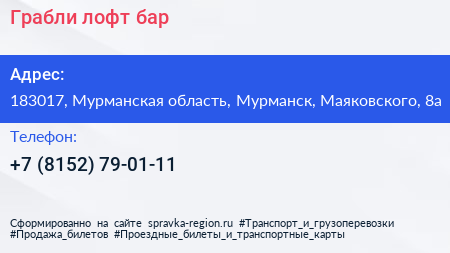 Грабли, лофт-бар по адресу 183017, Мурманская область, Мурманск, Маяковского, 8а в дальнейшем Организация, размещена в следующих категориях: