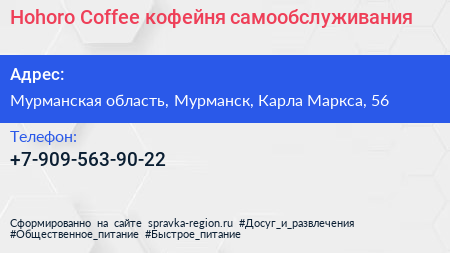 Hohoro Coffee, кофейня самообслуживания по адресу Мурманская область, Мурманск, Карла Маркса, 56 в дальнейшем Организация, размещена в следующих категориях: