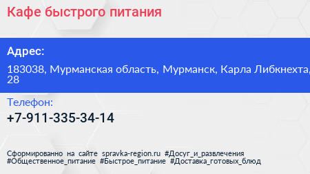 Кафе быстрого питания по адресу 183038, Мурманская область, Мурманск, Карла Либкнехта, 28 в дальнейшем Организация, размещена в следующих категориях: