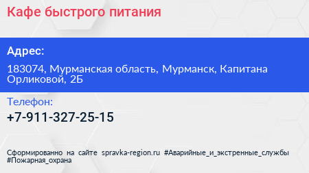 Кафе быстрого питания по адресу 183074, Мурманская область, Мурманск, Капитана Орликовой, 2Б в дальнейшем Организация, размещена в следующих категориях: