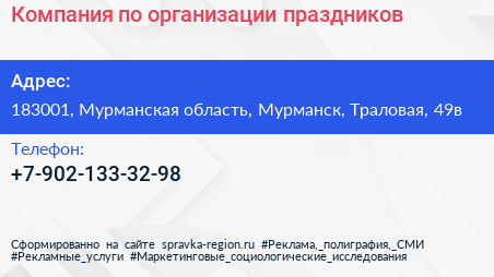 Компания по организации праздников по адресу 183001, Мурманская область, Мурманск, Траловая, 49в в дальнейшем Организация, размещена в следующих категориях: