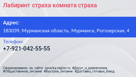 Лабиринт страха, комната страха по адресу 183039, Мурманская область, Мурманск, Рогозерская, 4 в дальнейшем Организация, размещена в следующих категориях: