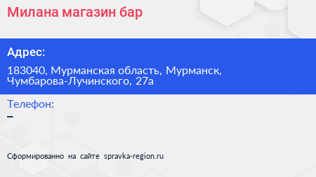 Милана, магазин-бар по адресу 183040, Мурманская область, Мурманск, Чумбарова-Лучинского, 27а в дальнейшем Организация, размещена в следующих категориях: