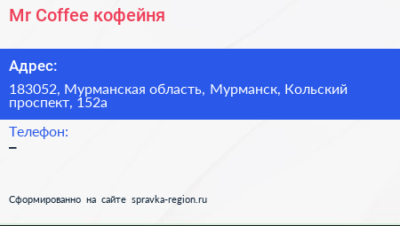 Mr. Coffee, кофейня по адресу 183052, Мурманская область, Мурманск, Кольский проспект, 152а в дальнейшем Организация, размещена в следующих категориях: