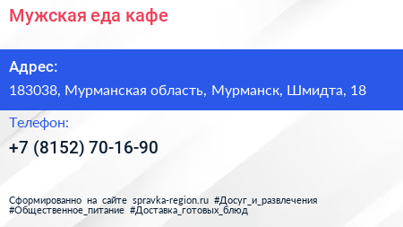 Мужская еда, кафе по адресу 183038, Мурманская область, Мурманск, Шмидта, 18 в дальнейшем Организация, размещена в следующих категориях: