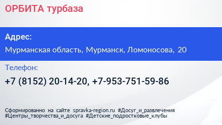 ОРБИТА, турбаза по адресу Мурманская область, Мурманск, Ломоносова, 20 в дальнейшем Организация, размещена в следующих категориях: