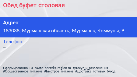 Обед-буфет, столовая по адресу 183038, Мурманская область, Мурманск, Коммуны, 9 в дальнейшем Организация, размещена в следующих категориях: