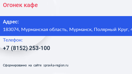 Огонек, кафе по адресу 183074, Мурманская область, Мурманск, Полярный Круг, 4 в дальнейшем Организация, размещена в следующих категориях: