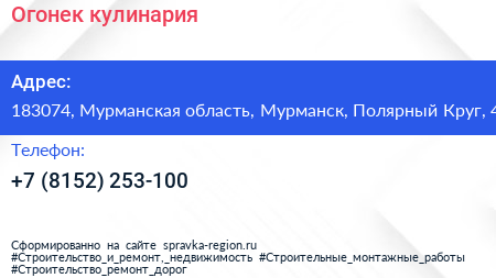 Огонек, кулинария по адресу 183074, Мурманская область, Мурманск, Полярный Круг, 4 в дальнейшем Организация, размещена в следующих категориях: