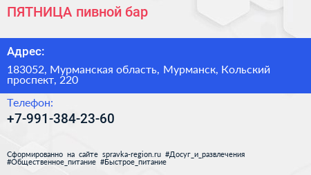 ПЯТНИЦА, пивной бар по адресу 183052, Мурманская область, Мурманск, Кольский проспект, 220 в дальнейшем Организация, размещена в следующих категориях: