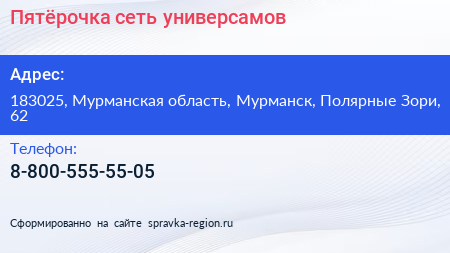 Пятёрочка, сеть универсамов по адресу 183025, Мурманская область, Мурманск, Полярные Зори, 62 в дальнейшем Организация, размещена в следующих категориях: