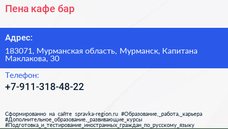 Пена, кафе-бар по адресу 183071, Мурманская область, Мурманск, Капитана Маклакова, 30 в дальнейшем Организация, размещена в следующих категориях: