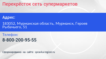 Перекрёсток, сеть супермаркетов по адресу 183052, Мурманская область, Мурманск, Героев Рыбачьего, 51 в дальнейшем Организация, размещена в следующих категориях: