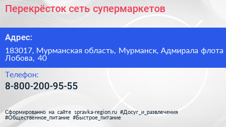 Перекрёсток, сеть супермаркетов по адресу 183017, Мурманская область, Мурманск, Адмирала флота Лобова, 40 в дальнейшем Организация, размещена в следующих категориях: