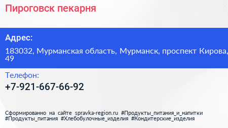 Пироговск, пекарня по адресу 183032, Мурманская область, Мурманск, проспект Кирова, 49 в дальнейшем Организация, размещена в следующих категориях: