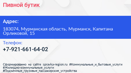 Пивной бутик по адресу 183074, Мурманская область, Мурманск, Капитана Орликовой, 15 в дальнейшем Организация, размещена в следующих категориях: