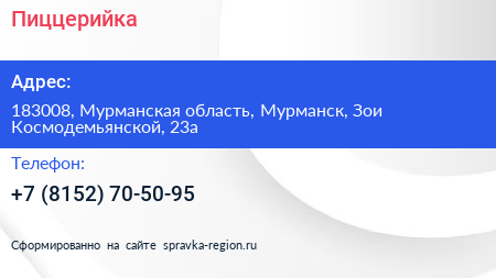 Пиццерийка по адресу 183008, Мурманская область, Мурманск, Зои Космодемьянской, 23а в дальнейшем Организация, размещена в следующих категориях: