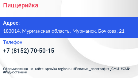 Пиццерийка по адресу 183014, Мурманская область, Мурманск, Бочкова, 21 в дальнейшем Организация, размещена в следующих категориях: