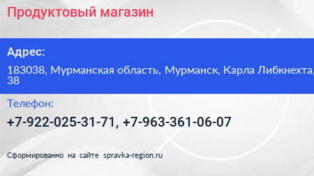 Продуктовый магазин по адресу 183038, Мурманская область, Мурманск, Карла Либкнехта, 38 в дальнейшем Организация, размещена в следующих категориях: