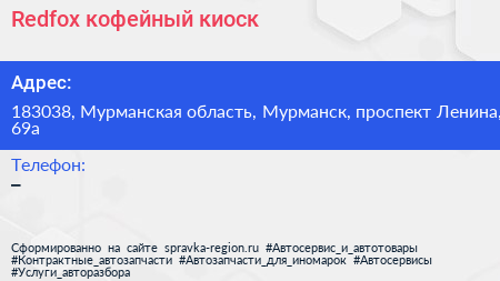 Redfox, кофейный киоск по адресу 183038, Мурманская область, Мурманск, проспект Ленина, 69а в дальнейшем Организация, размещена в следующих категориях: