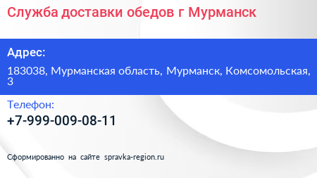 Служба доставки обедов, г. Мурманск по адресу 183038, Мурманская область, Мурманск, Комсомольская, 3 в дальнейшем Организация, размещена в следующих категориях: