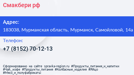 Смакбери.рф по адресу 183038, Мурманская область, Мурманск, Самойловой, 14а в дальнейшем Организация, размещена в следующих категориях: