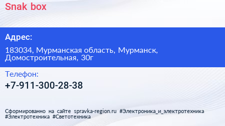 Snak box по адресу 183034, Мурманская область, Мурманск, Домостроительная, 30г в дальнейшем Организация, размещена в следующих категориях: