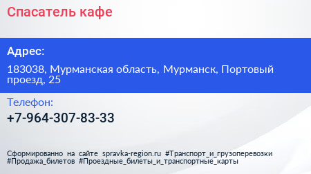 Спасатель, кафе по адресу 183038, Мурманская область, Мурманск, Портовый проезд, 25 в дальнейшем Организация, размещена в следующих категориях: