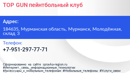 TOP GUN, пейнтбольный клуб по адресу 184635, Мурманская область, Мурманск, Молодёжная, склад 3 в дальнейшем Организация, размещена в следующих категориях: