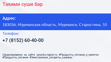 Такими, суши-бар по адресу 183036, Мурманская область, Мурманск, Старостина, 55 в дальнейшем Организация, размещена в следующих категориях: