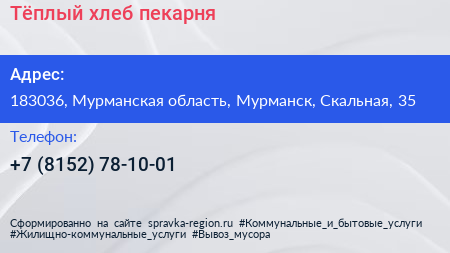 Тёплый хлеб, пекарня по адресу 183036, Мурманская область, Мурманск, Скальная, 35 в дальнейшем Организация, размещена в следующих категориях: